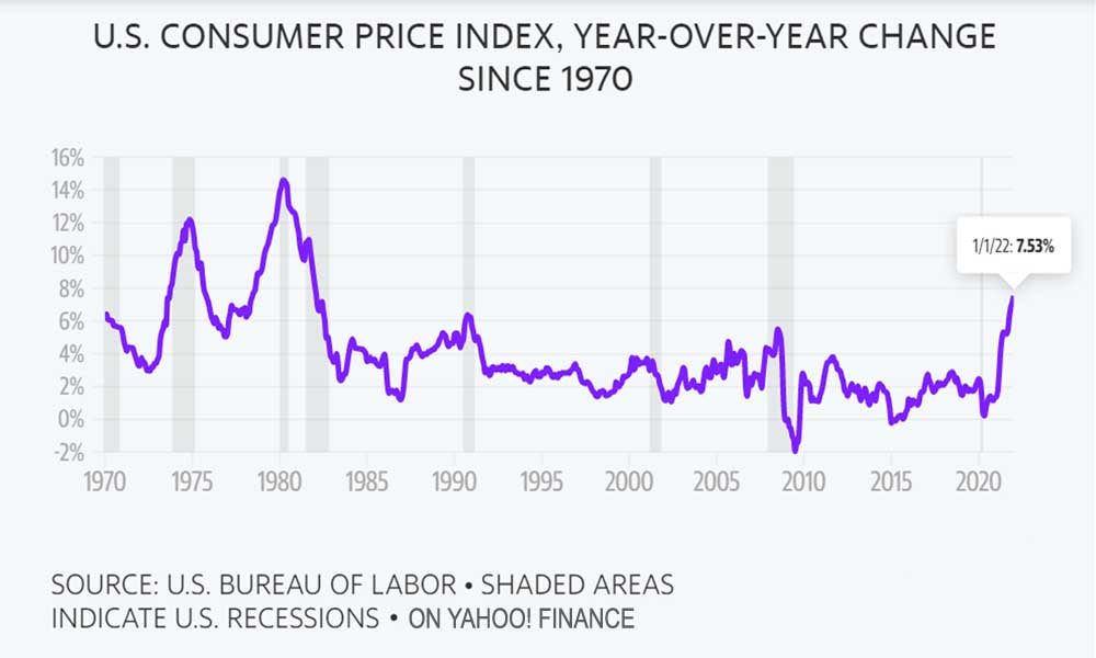 The consumer price index, or CPI, is a standard measure of inflation. Based on the latest CPI data, prices increased 7.5% from January 2022 to January 2022 – the MOST in 40 years.1 A little bit of inflation is considered healthy for the economy, but 7.5% in a single year is high.
